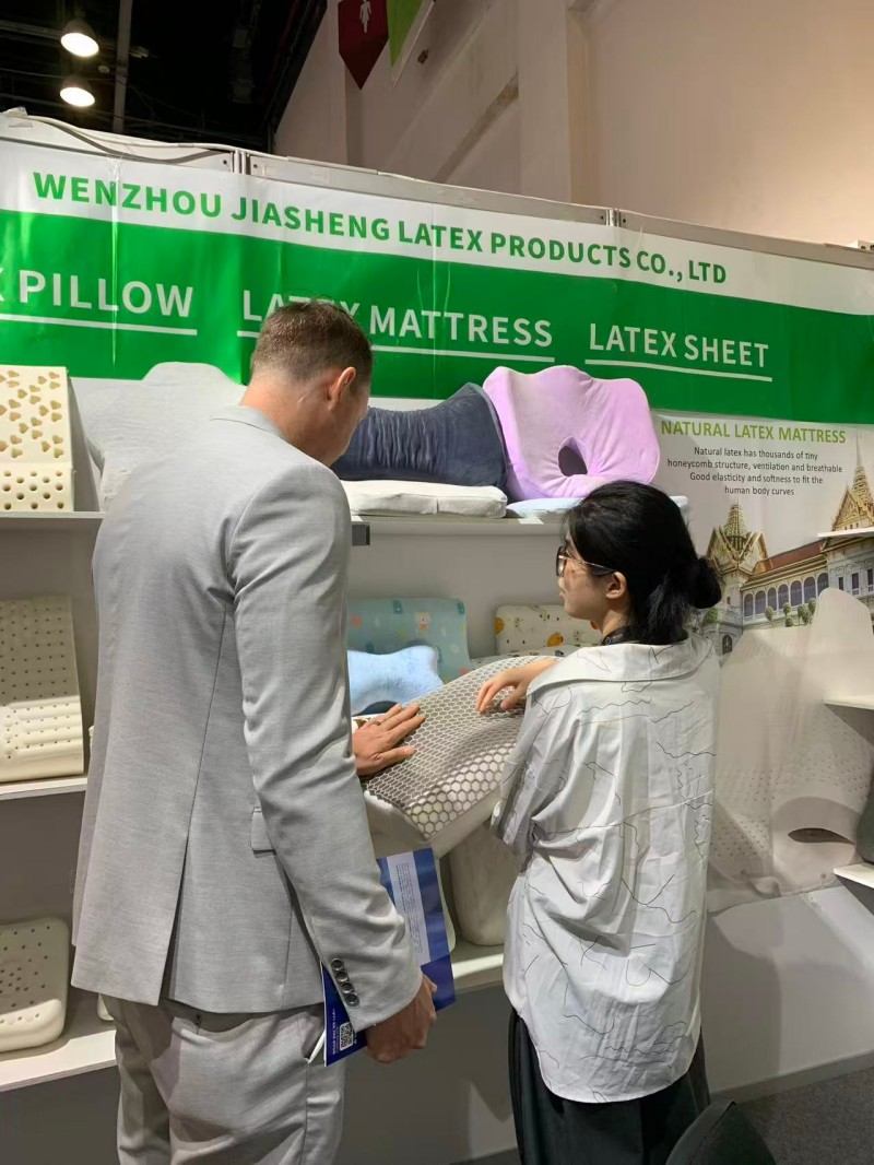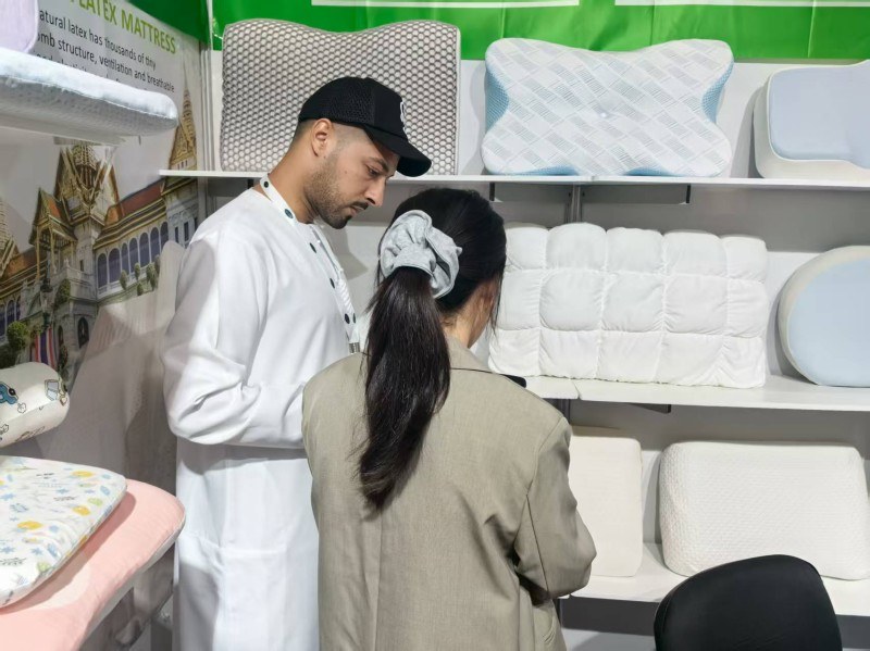Sa eksibisyon ng pagtulog ng Dubai na ito, pinarangalan kaming ipakita ang aming mga unan na nakatuon sa pagtulog sa mga bisita mula sa buong mundo. Kami ay nakatuon sa pagpapakita ng dalawa sa mga pinakamahusay na nagbebenta ng mga unan sa merkado: angLikas na unan ng latexat ang modernong matalinong materyalmemorya ng unan ng memorya. Ang mabilis na rebound at anti-allergy na mga katangian ng latex ay lubos na pinapaboran ng mga mahilig sa latex. Samantala, ang pangwakas na akma ng memorya ng bula ay maaaring magbigay ng matulog na pagtulog. Ang aming malalim na komunikasyon sa mga customer sa site ay nagparamdam sa amin ng kanilang hangarin ng mga unan. Lubos kaming naniniwala na ang pagbibigay ng mga personalized na pagpipilian para sa iba't ibang mga gawi sa pagtulog ay ang susi sa kalidad ng pagtulog.